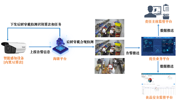 優(yōu)仕響應(yīng)國家市場監(jiān)管總局對“明廚亮灶”工作部署要求,以及教育局對學(xué)校食品安全監(jiān)管的實際需要,采用“視頻+AI” 技術(shù),借助海康威視AI開放平臺訓(xùn)練的場景化AI算法,構(gòu)建集智能事件預(yù)警、處置、統(tǒng)計等功能為一體的“智慧食安”解決方案。